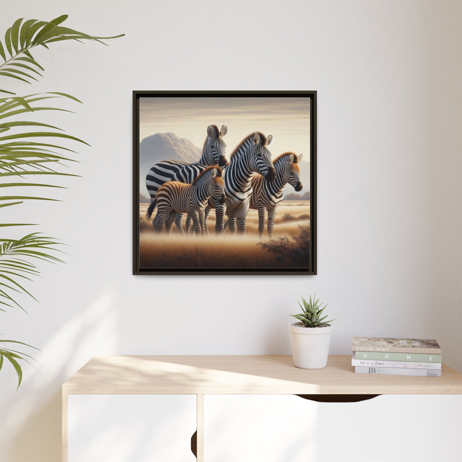 A warm, whimsical canvas print that brings a gentle, familial scene to any room. The framed matte surface softens light and draws the eye to the delicate silhouettes of a zebra family, rendered with playful color and quiet charm. Hang it above a low bookshelf, in a nursery corner, or along a gallery wall to add a touch of storytelling — the piece feels lived-in and calm, like the hush after a day of exploration. This canvas sits comfortably in homes that favor thoughtful, sustainable choices and visual pieces that invite a second look. The pine frame adds organic texture and a subtle grounding edge to the art, letting the zebras remain the focal point while giving the whole piece an approachable, natural presence.